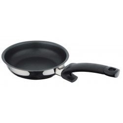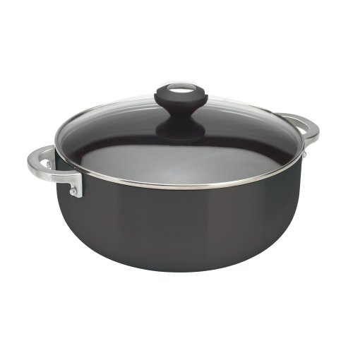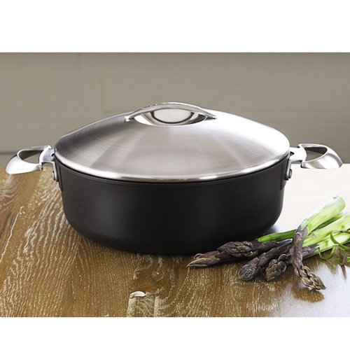 Now dishwasher-safe, Scanpan's nonstick cooking surface is impossible to scrape away, even with metal utensils. The heavy-duty, pressure-cast aluminum body has an extra-thick base for quick, even heating, and the extraordinarily hard exterior surface is a ceramic and titanium compound, super-heated and fired on for lasting strength. Patented spring-lock handle stays cool during normal stovetop use.
